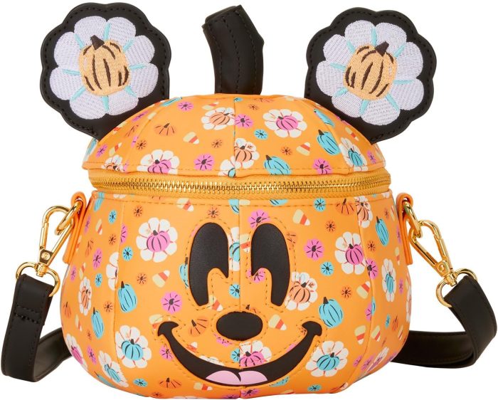 Check out this Mickey Pumpkin Crossbody Loungefly Bag! This bag looks like Mickey Mouse in the shape of a pumpkin. You’ll find an all-over print of pumpkins and candy corn, really decorating the bag, and its 3D ears feature pumpkins in the center. Also, his face glows! You can get the bag for 11% off right now.