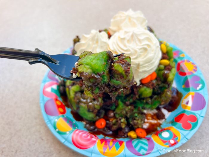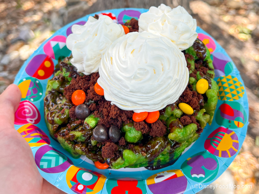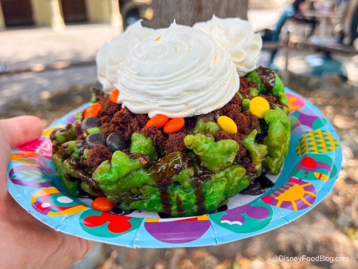 The Monster Funnel Cake certainly lives up to its monstrous name. It’s a green funnel cake (yep, it’s GREEN) with chocolate sauce, crumbled brownie, peanut butter candy pieces, and whipped cream for $10.29. There’s a lot to unpack with all those ingredients, but let us tell you now…they work! Also, LOOK at those mounds of whipped cream shaped like Mickey. That’s just the literal frosting on top of this cake.