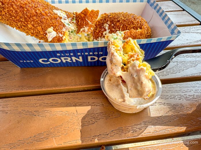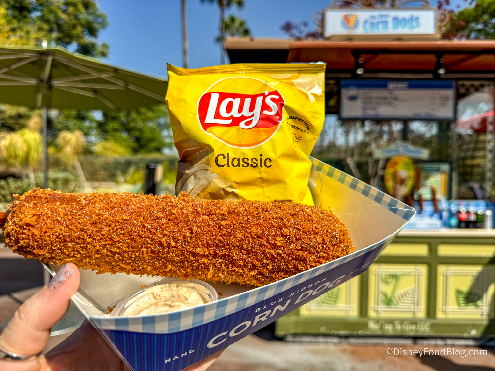 While I remain in the Sunshine State — devoid of this snack — in a cruel twist of fate, I do get the pleasure of bringing our reporter’s findings to you in the form of this review. So, find out what’s cookin’ at Blue Ribbon Corn Dogs at Downtown Disney!