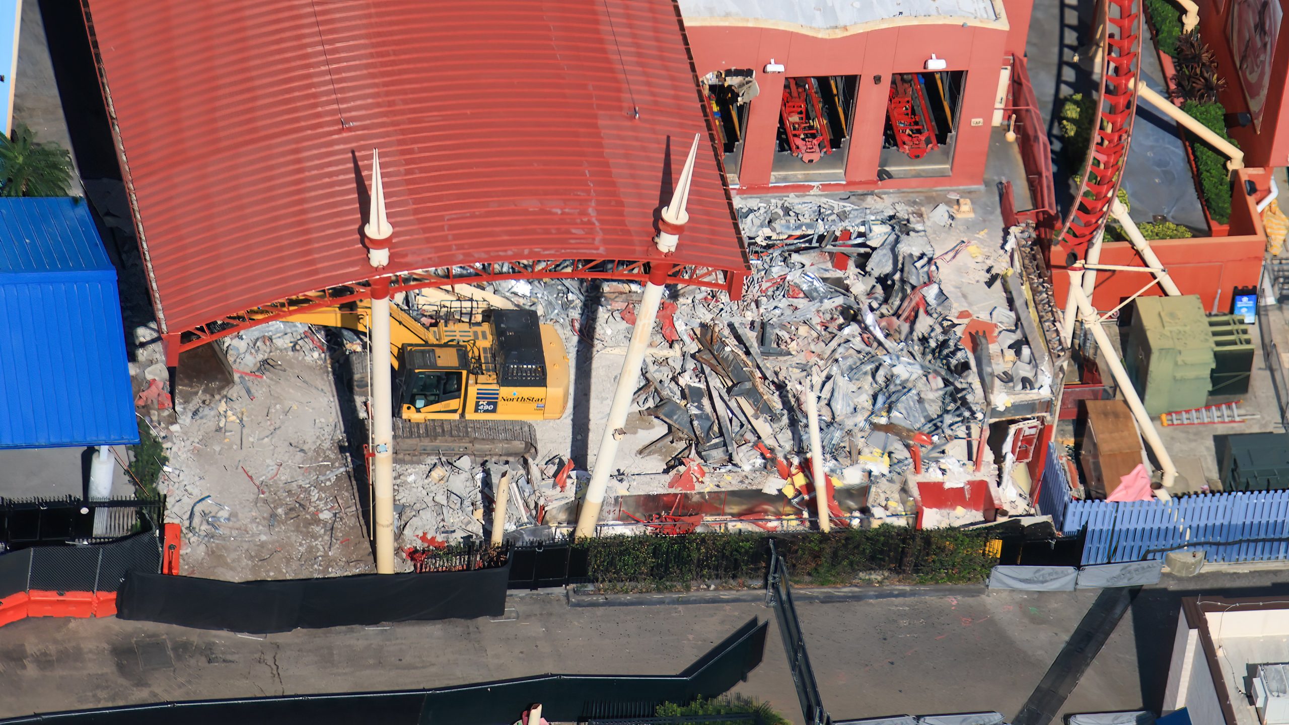 Thanks to our friend @bioreconstruct over on X/Twitter, we’ve got an update on the demolition of Hollywood Rip Ride Rockit at Universal Orlando. The ride officially closed on August 18th, 2025, and we’re eager to find out what will take its place. You can check out aerial photos of the demolition below — including the queue and loading area, seen here. The ride featured a second-story loading platform, which has now been demolished.