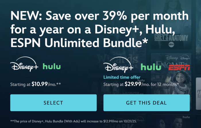 Currently, you can get Disney+ and Hulu together with ads for $10.99 a month. However, starting on October 21st, the price will be going up to $12.99 a month — a $2 increase. That may not sound like a lot, but that $24 more if you get it for twelve months, and that can really throw some finances off. Additionally, the Disney+, Hulu, and HBO Max bundle with ads will increase from $16.99 a month to $19.99 a month, and if you’d like that bundle without ads, it’ll increase to $32.99 a month.
