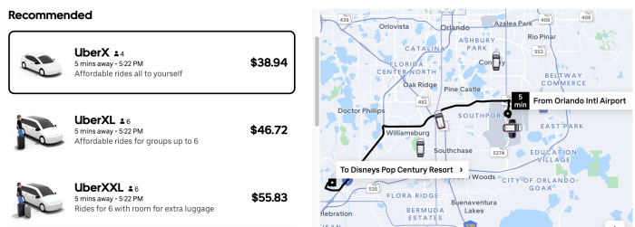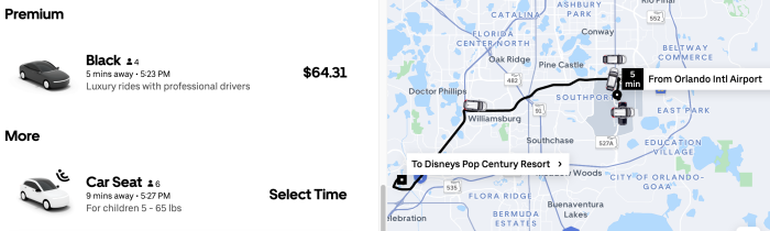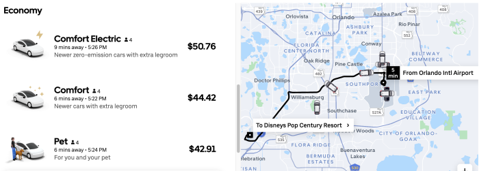 Looking at a sample trip from the Orlando Airport to Disney’s Pop Century Resort, there are several types of rides available at any given time. You’ve got the “Premium” category with Uber Black. Then, there’s the “Economy” category, which might sound like the cheapest option, right? WRONG. This is where things get confusing.