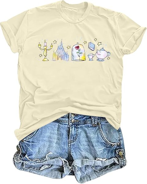 The Beauty and the Beast Magic Kingdom T-Shirt is available in pink, apricot, and grey colors on Amazon in a variety of sizes. The shirt combines the love of the classic animated film with Magic Kingdom, featuring a graphic of iconic elements from the movie, such as Lumiere and the red rose, as well as a design of Cinderella Castle.