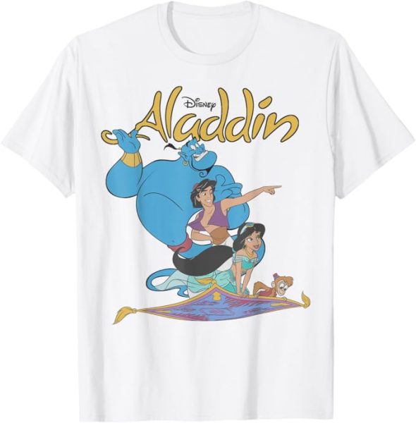 Also available in several colors and fits, this Aladdin T-Shirt is PERFECT for fans of the 1992 movie and features Aladdin, Princess Jasmine, Abu, Genie, and the magic carpet on the front.