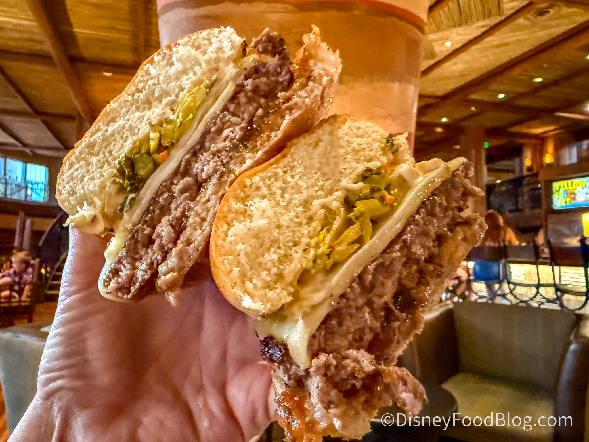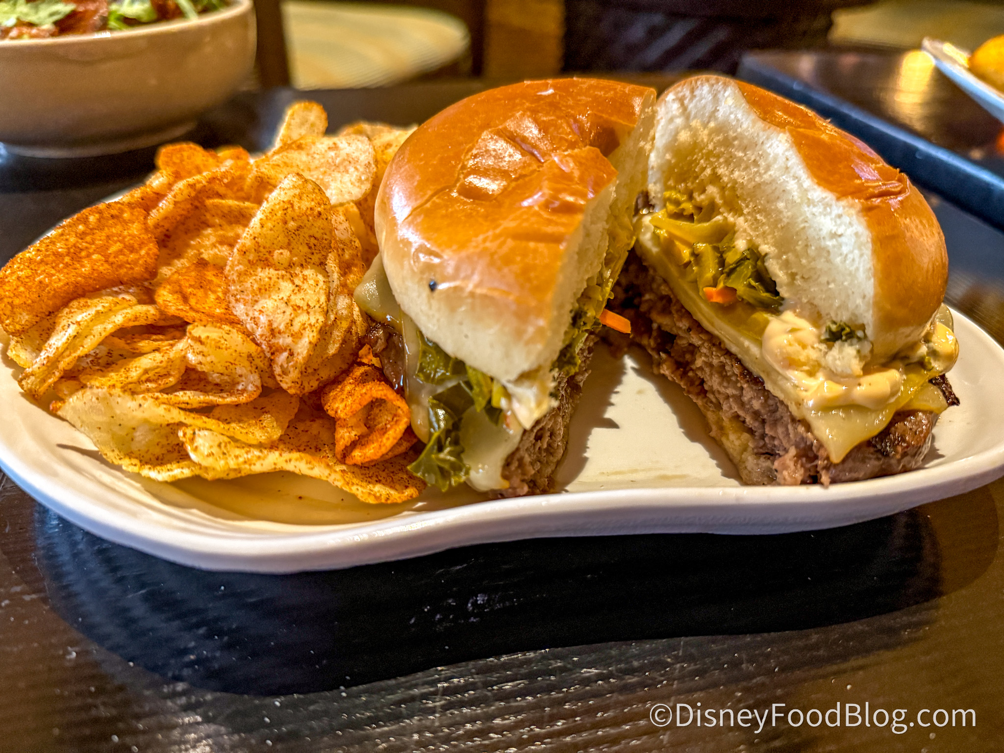 We’ve tried many burgers at Disney World, and this is a fun and unique version of the traditional burger. The patty was thick and very tender, packed with flavor due to its high-fat content. It came on a brioche bun with two layers of Munster cheese, which we don’t often see. Instead of a pickle, there was a pickled green tomato, and the aioli and jam gave it sweetness.