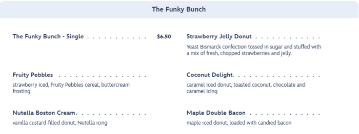 There is also The Funky Bunch, which include flavors like Fruity Pebbles, Nutella Boston Cream, and Maple Double Bacon.