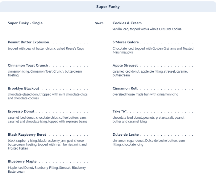There is also a category of donuts called Super Funky. This category includes flavors like Peanut Butter Explosion, Brooklyn Blackout, Apple Streusel, and more.