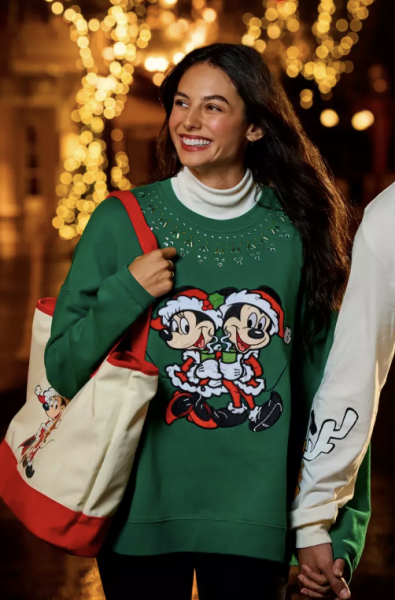 Want the perfect cozy sweater for the season? Check out the Santa Mickey and Minnie Mouse Holiday Pullover Sweatshirt! This green sweatshirt has Santa Mickey and Minnie enjoying hot chocolate on the front, but we love the jeweled detailing on the top as well (look for those hidden Mickeys!).