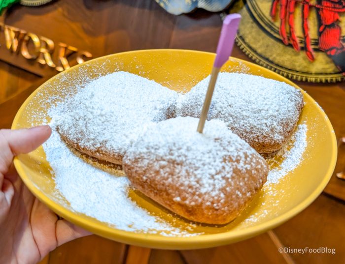 We were pleasantly surprised by these! While they didn’t taste like traditional beignets, they were definitely beignet-like. They tasted more like funnel cake to us than the flavor we’re used to with non-gluten-free beignets, but to us, they were still better than the beignets at Magic Kingdom. There was a really good balance of crisp on the outside, with soft and doughy on the inside.