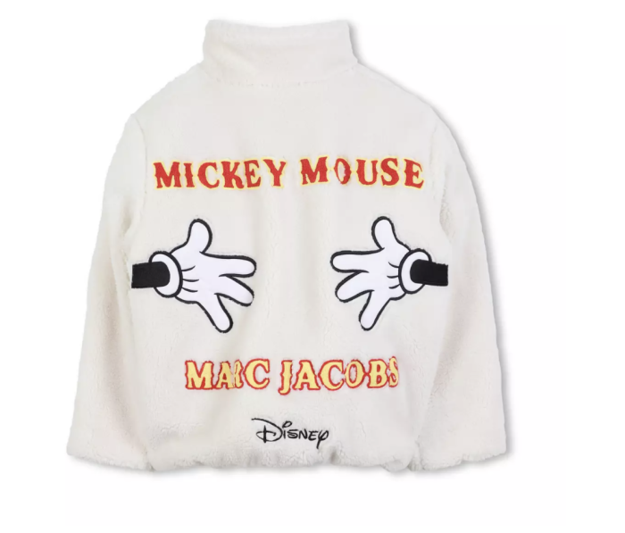 First up, we have this faux shearling jacket! It features an embroidered Mickey face on the front along with a yellow zipper for a pop of color. There are also two front pockets with a yellow snap closure. On the back, you can see a pair of Mickey’s iconic gloves, looking like they’re giving you a big hug! You can also see the words “Mickey Mouse” and “Marc Jacobs” embroidered on the back.