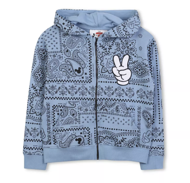If you love the bandana design, you’re going to love this zip-up! This jacket features paisley detailing and references the year 1984, which is when the Marc Jacobs brand was founded. Mickey’s face and name are embroidered along the back of the jacket. The Mickey glove peace sign is embroidered front and center. There’s Disney in every detail in this jacket!