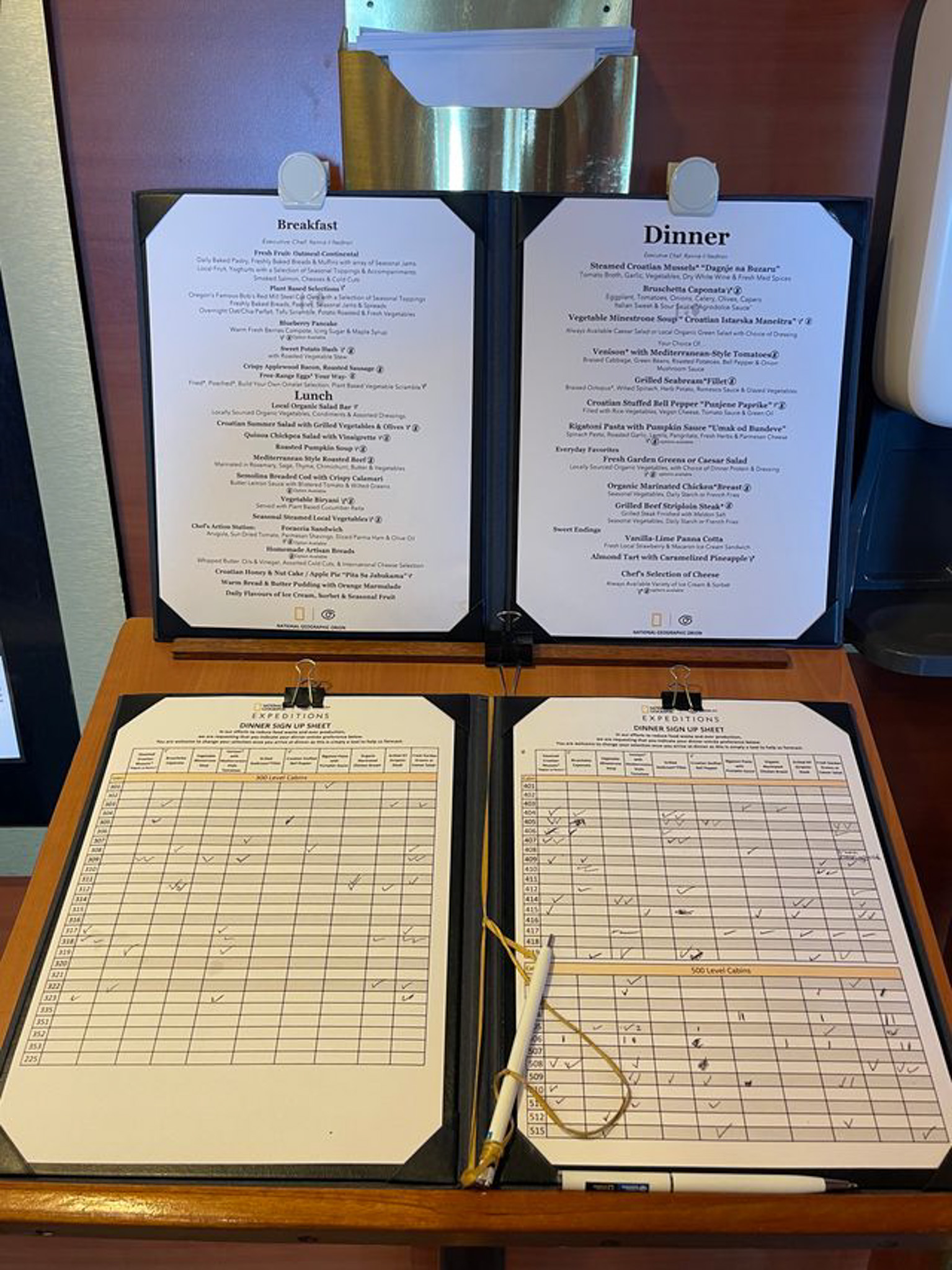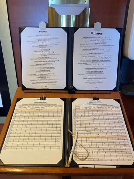 - Of note with dinner, the day’s entrees are posted in the morning, with cruisers asked to make a tentative selection as a way to lessen food waste and allow the crew to judge how much of each item will be needed on a given day. If you wanted more than one entree, you could check more than one box. If you changed your mind by dinner time, that was also allowed. We LOVED this idea.