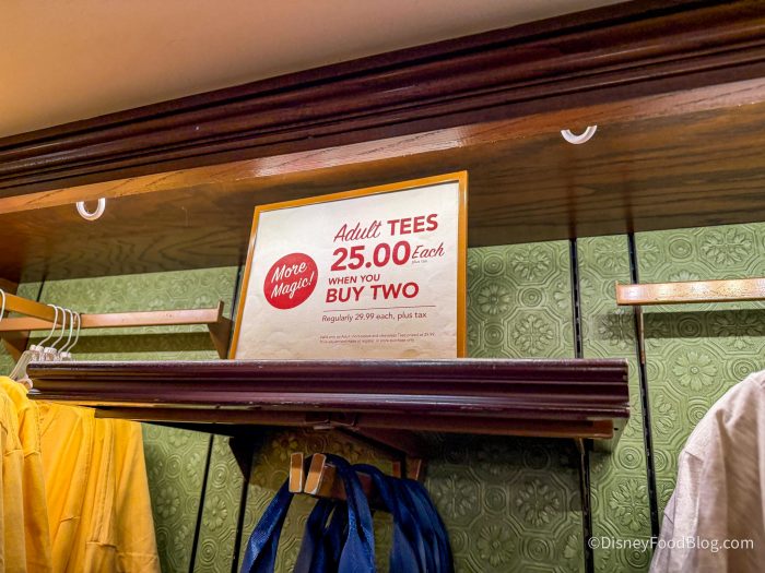 Last week when we stopped inside The Emporium, we noticed that the folded t-shirts/the ones displayed on the wall were $25 each when you buy two — like we’ve seen for as long as we can remember. If you only buy one, they’re $29.99.
