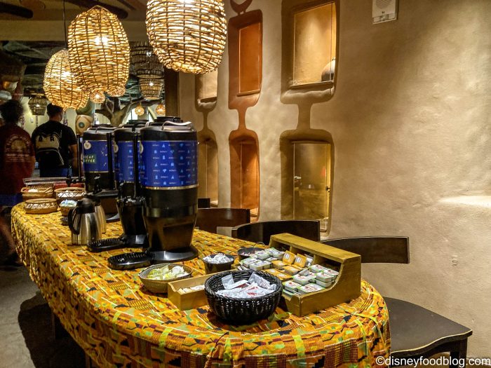 This is also where you’ll find the coffee bar, along with condiments and utensils to bring to your table.