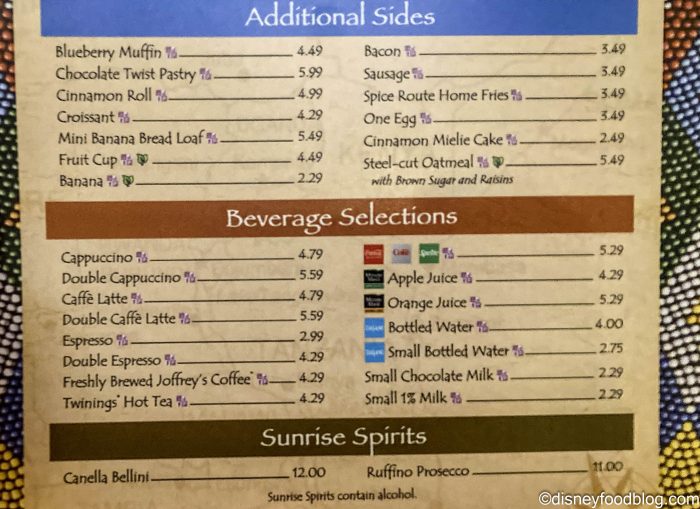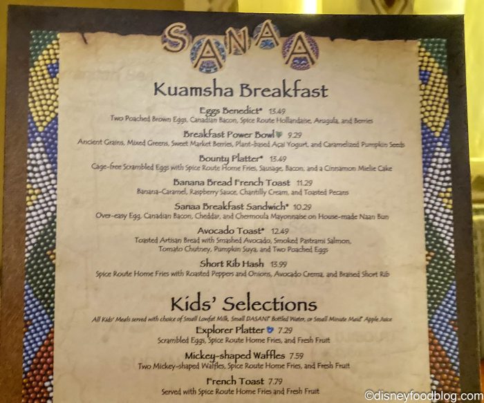 Entrees include — but aren’t limited to — the classic Disney Bounty Platter, Banana Bread French Toast, Eggs Benedict, Avocado Toast, and the Sanaa Breakfast Sandwich.