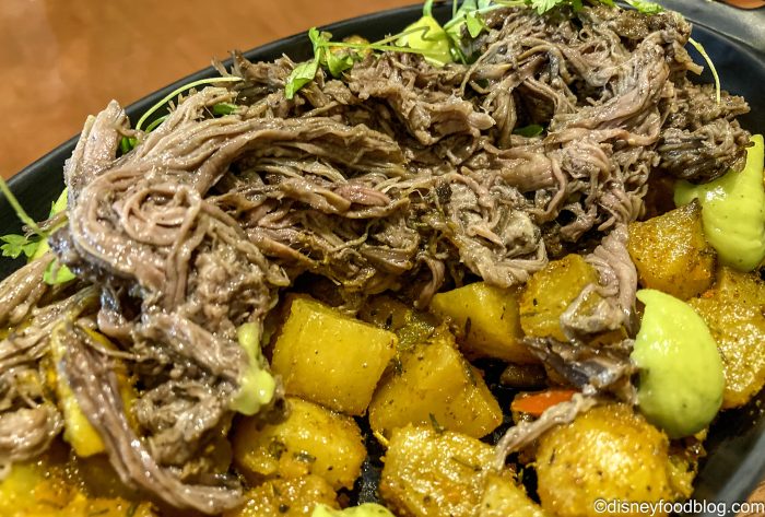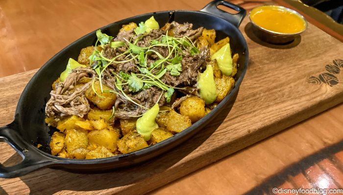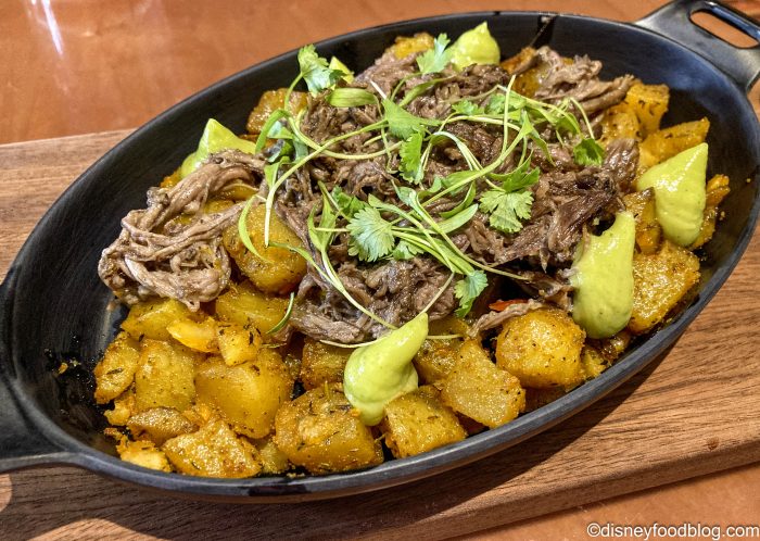 The Braised Short Rib is plated in a skillet atop Spice Route Home Fries with roasted peppers and onions and a few dollops of an avocado crema.