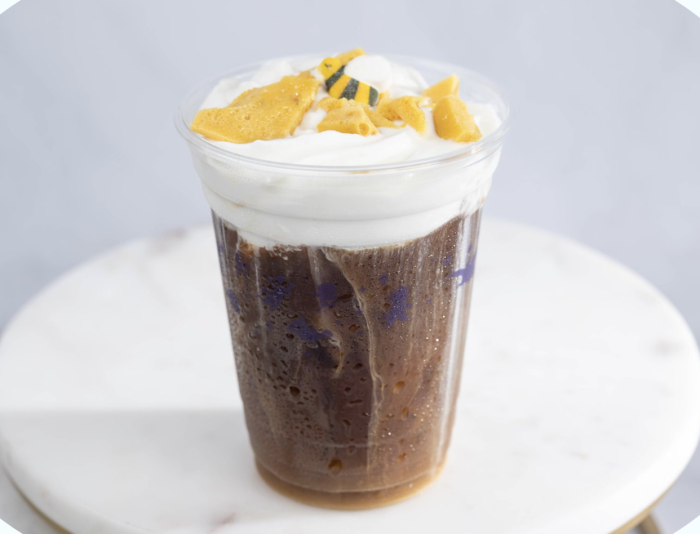 Over in Magic Kingdom, there are TWO new cold brew drinks! The first is the Honey-Lavender Cold Brew coming to Golden Oak Outpost, which is made with Joffrey’s Cold Brew Coffee with honey-lavender cold foam, honeycomb toffee, and a sugar candy piece.