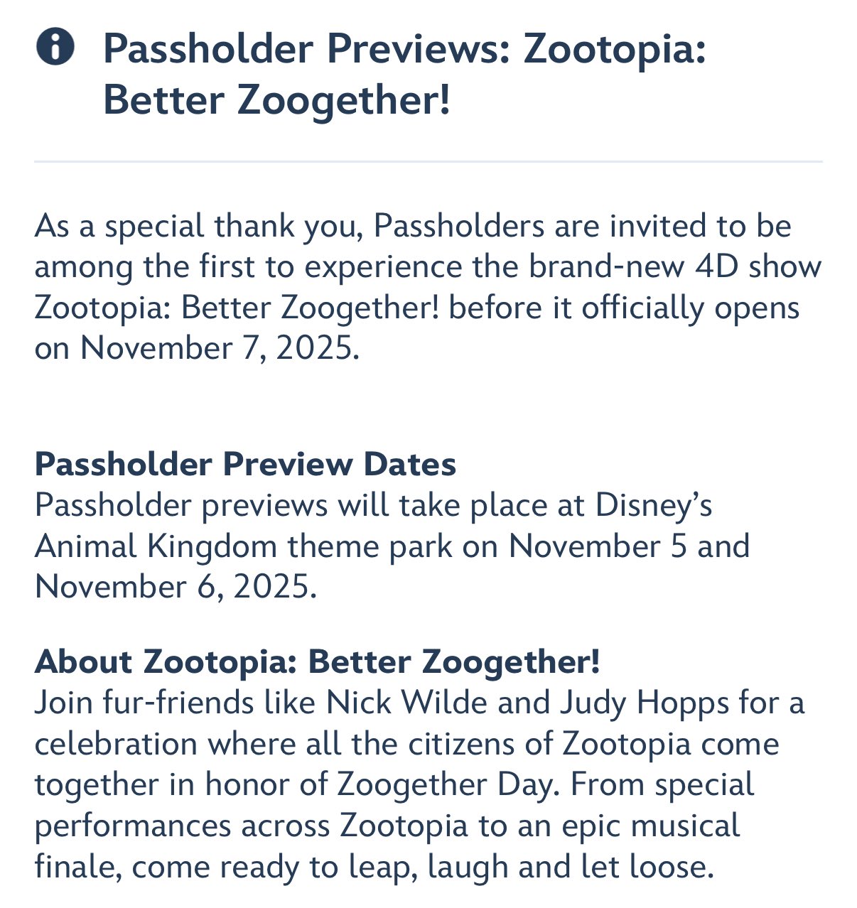 One of the ones we’re most excited about is the new Zootopia: Better Zoogether! show coming to the Tree of Life Theatre! This new show will debut on November 7th, along with a new meet and greet with Nick Wilde and Judy Hopps just outside the Tree of Life area, but we’ve wondered for a while if there will be any previews for Annual Passholders or DVC members. Now, we finally have our answer!