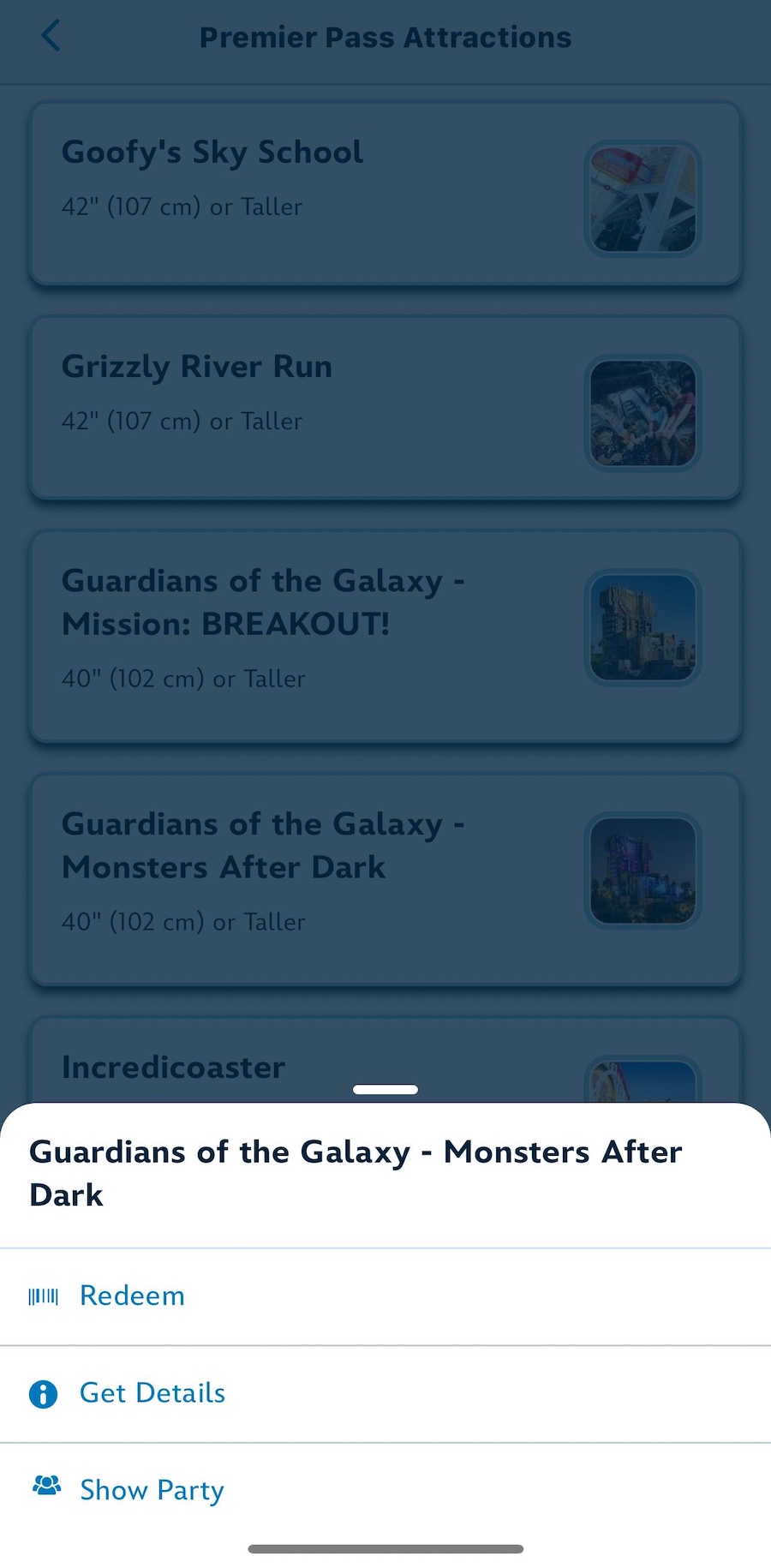 Both Guardians of the Galaxy: Mission Breakout and Guardians of the Galaxy: Monsters After Dark — the spooky Halloween overlay of the Marvel-based attraction that runs each night during the season — are eligible for Premier Pass rides.