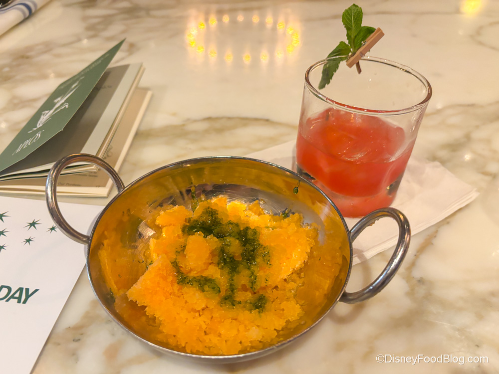 We were invited by Enzo’s Hideaway in Disney Springs to check out a media preview of the Mindful Midday Pairing, which was held in partnership with the non-alcoholic spirits brand Aplós. We got a chance to sample three courses from the restaurant matched with non-alcoholic beverages that “include functional ingredients that still produce a calming sensation, but avoid alcohol’s harmful effects.”