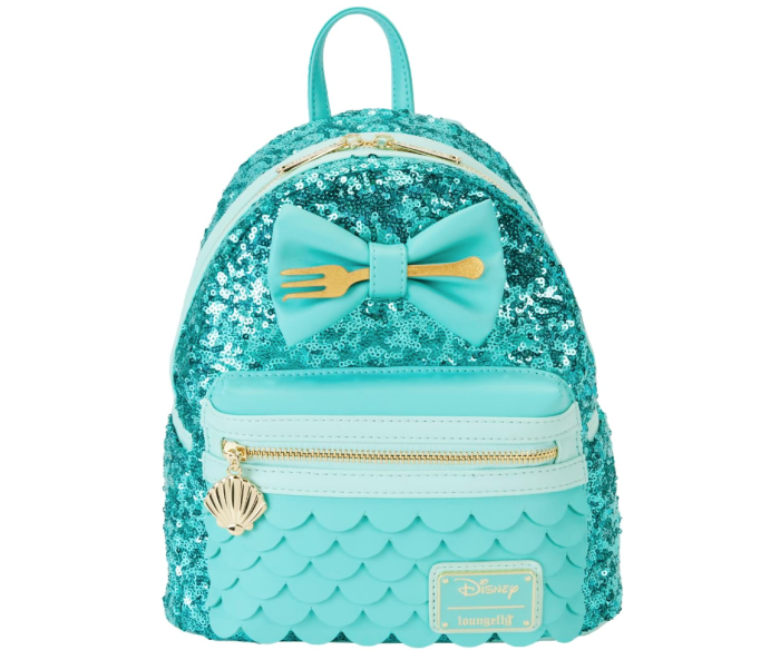 For a fancier design, check out this The Little Mermaid Sequins Collection Backpack. With sequins, scales, and a “dinglehopper” topped bow, it’s the perfect ode to Ariel. The sequins are so sparkly and chic!
