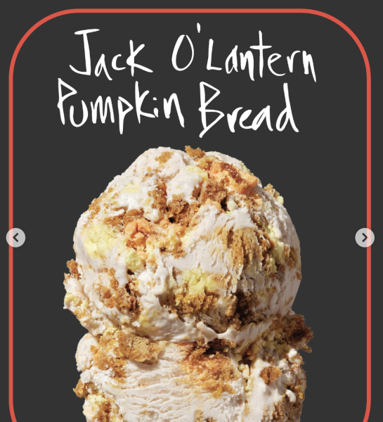 Next, we have the Jack o’ Lantern Pumpkin Bread! It’s made with pumpkin spice ice cream, pumpkin bread, and a thick layer of cream cheese frosting in one of three colors: yellow, orange, or white. It’s meant to mirror candy corn!