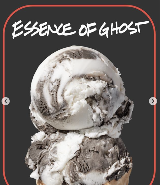 The Essence of Ghost has white sherbet infused with scotch and Mexican vanilla. It also features “wisps” of black licorice chocolate ice cream.