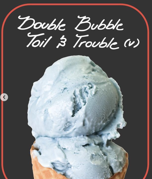 You can also try the Double Bubble Toil and Trouble! This one is returning after a “brief hiatus” and is a take on dairy-free bubblegum ice cream. It uses pineapple, banana, and pear blended into creamy coconut milk with cinnamon and vanilla. Plus, the bright blue hue comes from spirulina, a natural algae.