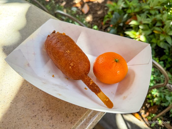 The menu here is pretty limited, as it’s only focused on, you guessed it, corn dogs! Specifically, you can grab a Hot-Link Corn Dog, Original Corn Dog, or the Cheddar Cheese Stick. Each one is served with your choice of a Cuties orange or a bag of chips. To drink, you can grab a few different sodas, Bottled Water, Hot Cocoa, or Coffee.