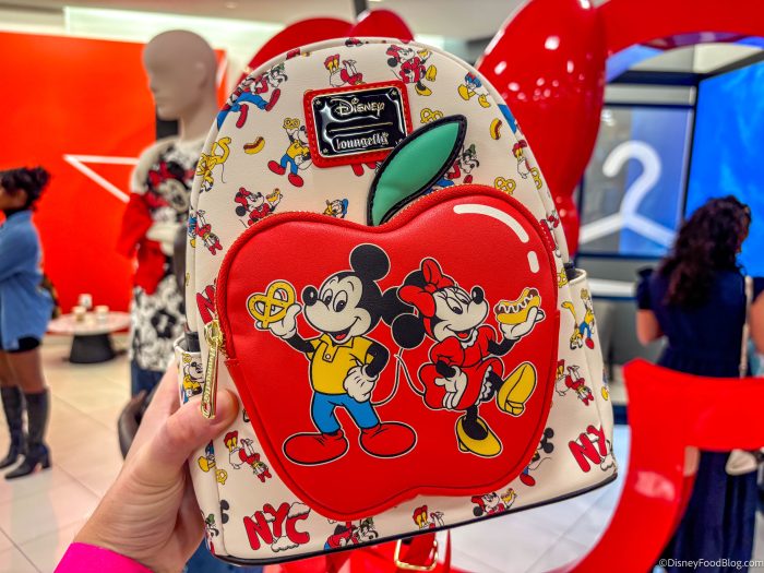 One of our favorite items from this group is the Mickey and Minnie Loungefly Mini Backpack. It’s “Big Apple” themed with an apple-shaped pocket, NYC-themed artwork, and Mickey and Minnie on the front eating classic New York snacks.