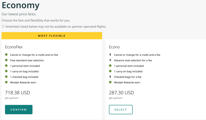 If you purchase an Economy ticket, note that certain ticket types may have restrictions. The “Econo” Economy ticket, for example, does not come with advance seat selection, and any changes or cancelations will cost an extra fee. Checked bags are also not included in the cheapest ticket type.