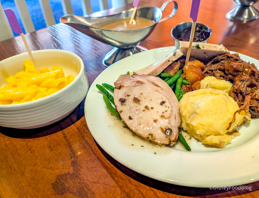 We also tried the allergy-friendly Bill of Fare with most of the same items, although the dressing is an Herbed Rice Bread Stuffing. However, they make adjustments so there’s no gluten on the plate. As you can see, Disney puts little purple-colored markers on the allergy-friendly foods.