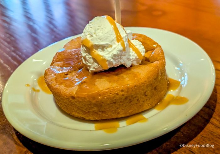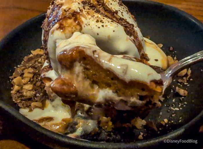Okay, time for dessert and that famous Ooey Gooey Toffee Cake, which is a Vanilla Toffee Cake, Chocolate Sauce, and Vanilla Ice Cream. A lot of people come here JUST for this dessert, and we get it. Of every table service dessert in Disney World, this is up there at the top of our list. It IS sweet (all that sugary toffee), rich, and OH SO DECADENT, but that warm cake with the ice cream on top? PERFECTION. We think the cake is supposed to be shared, but we ate entirely more than our share. AND WE ARE NOT ASHAMED.