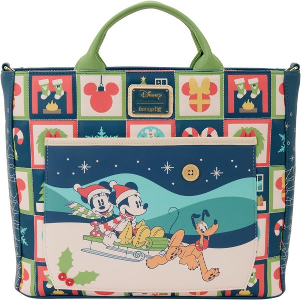 If you aren’t a huge fan of the mini backpack, this might be the bag for you! It’s a tote bag that features convertible straps so you can carry it like a backpack or like a side purse. You can see Mickey and Minnie in their holiday best on their sled being pulled by Pluto! It has the same overall print as the mini backpack above.