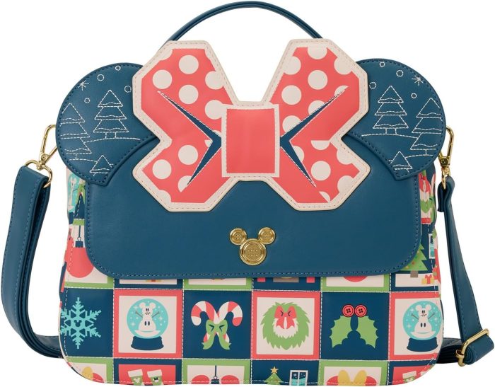 Next, we have the final piece in the holiday collection! This crossbody bag is inspired by Minnie Mouse. It has an all-over pattern featuring snow globes, candy canes, wreaths, snowflakes, and more, which matches the other bags. It has a molded metal rivet of Mickey Mouse’s silhouette on the front flap. It has applique ears with Minnie’s bow right on top.