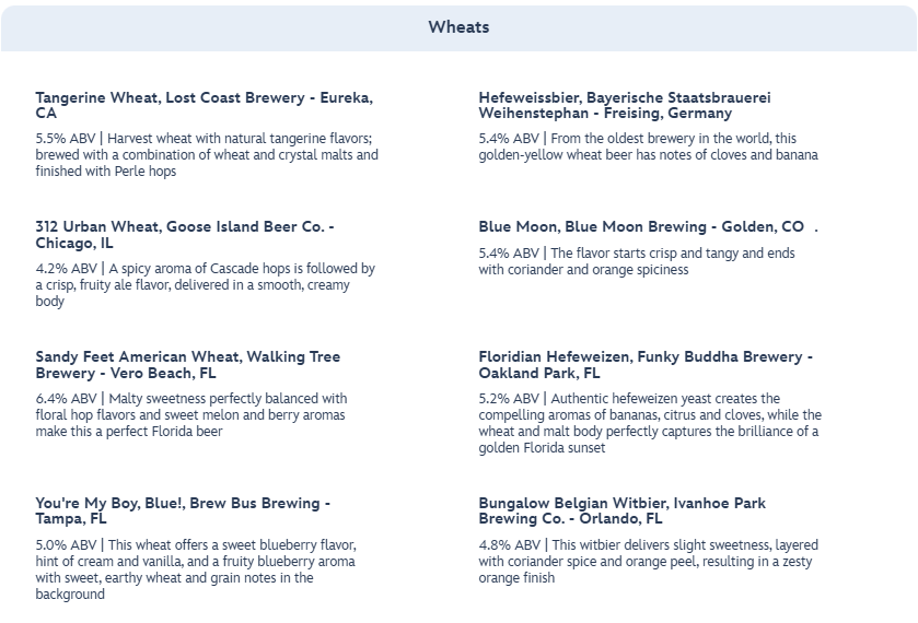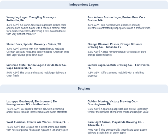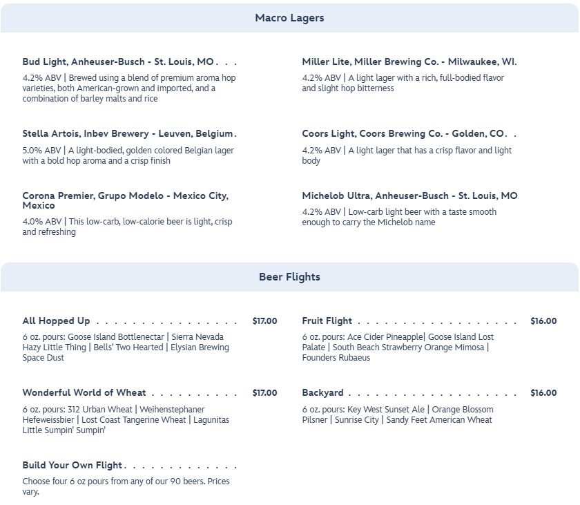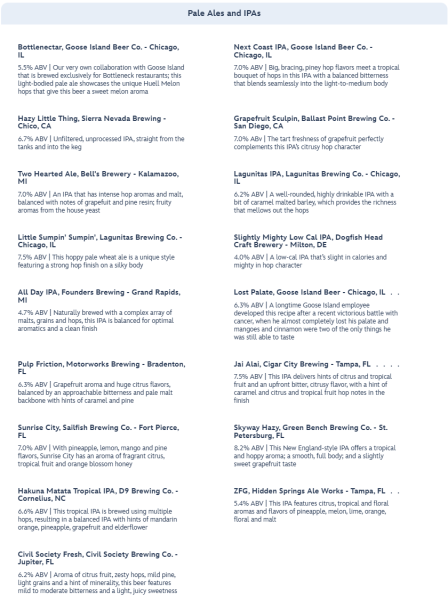 Now that we have gone over the food options, buckle up for the extensive list of beers and other alcoholic beverages! You can choose from Goldens, Ambers, and Browns.