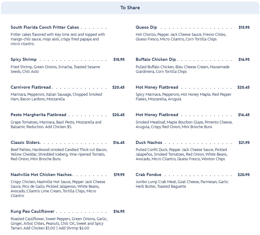 There are also quite a few options for food that is great for sharing. You can get Buffalo Chicken Dip, Spicy Shrimp, and Crab Fondue.