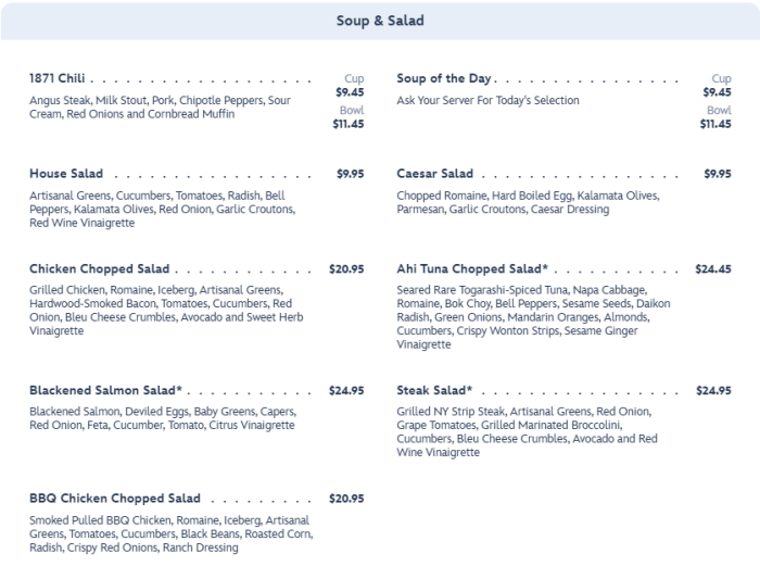 You can also choose from soup & salad options like 1871 Chili or a Chicken Chopped Salad.