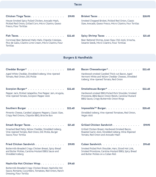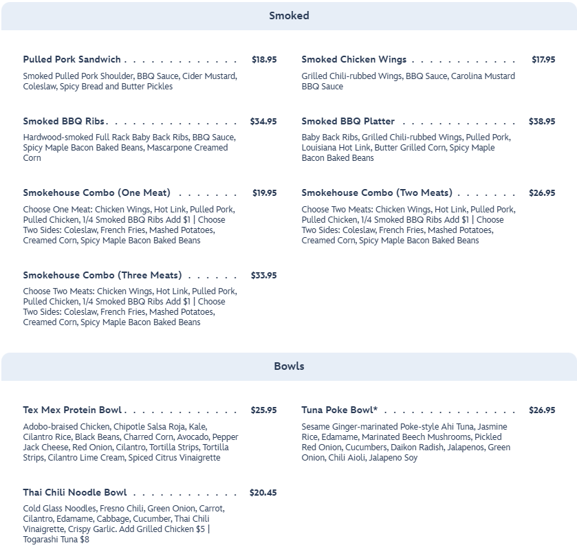 The menu also features a smoked section, where you can get a Pulled Pork Sandwich, Smoked BBQ Platter, or Smoked BBQ Ribs. There are also options for bowls like a Tuna Poke Bowl or a Thai Chili Noodle Bowl.