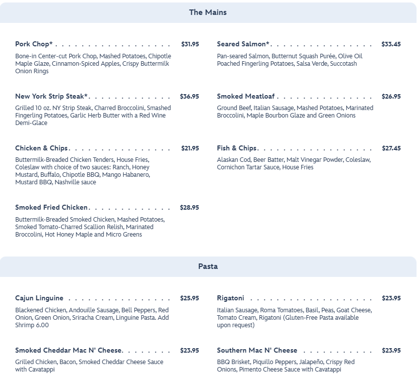 You can also choose from mains like Seared Salmon, Smoked Meatloaf, and Fish & Chips. There are also options for pasta.