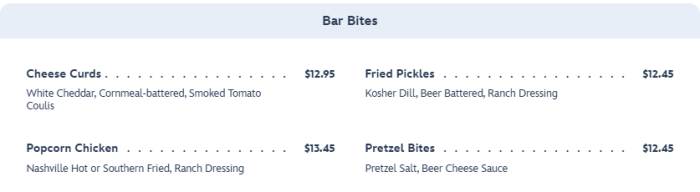 The menu at City Works Eatery & Pour House is pretty extensive — in both food options and especially alcoholic drink options. You can choose from some bar bites like Cheese Curds or Pretzel Bites.
