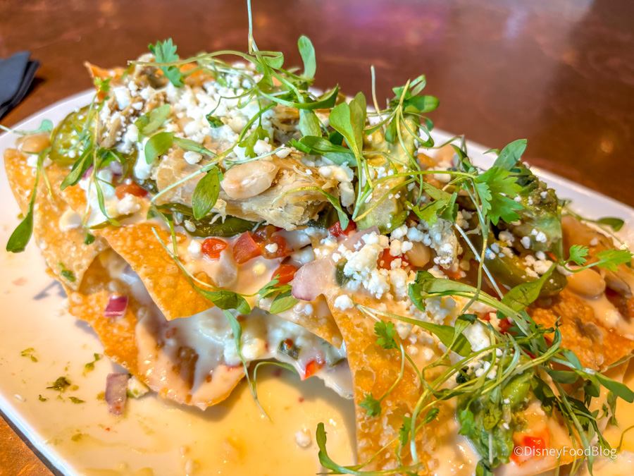 First up, we got the Duck Nachos for $21.95. These are made with pulled confit duck, pepper jack cheese sauce, pickled jalapeños, smoked tomatoes, red onion, white beans, avocado, micro cilantro, queso fresco, and wonton chips.