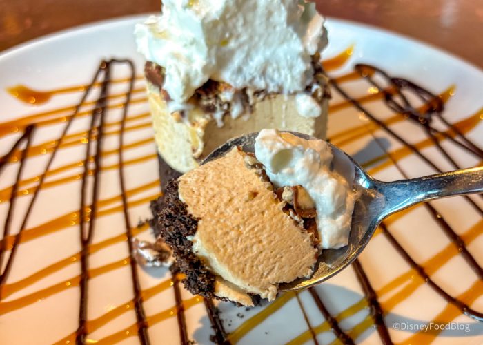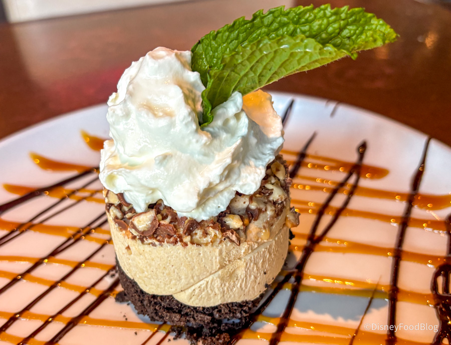 In addition to being stunning, this was also an incredibly delicious dessert. The peanut butter mousse was on top of a crumbly, crispy Oreo cookie crust. The mousse was then topped with crushed Snickers bars and finished with whipped cream. The plate was decorated with chocolate and caramel drizzle. It may not look huge, but it fills you up fast. The mousse was more similar to a cheesecake filling, not super light and airy, but rather a bit thicker.
