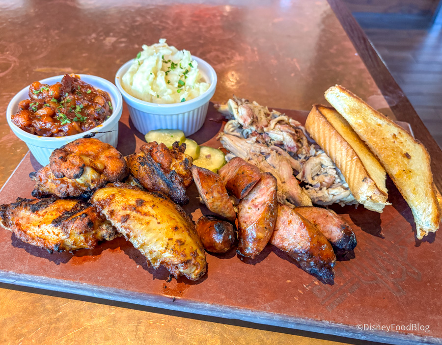 Next, we had the Smokehouse Combo with Three Meats, which is $33.95. We chose chicken wings, hot links, and pulled pork with baked beans and mashed potatoes.