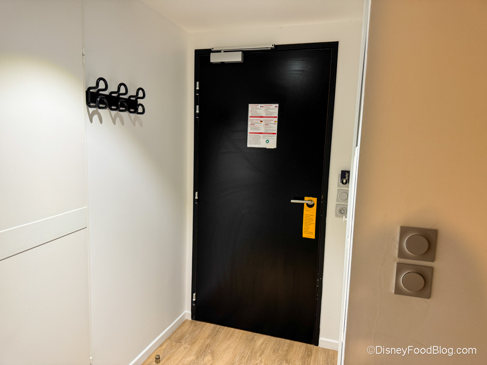We stayed in a Family apartment at the hotel, which is perfect for up to five people. Like in most hotels, your door opens into a little hallway that then leads into the room. You’ll find some handy coat hangers near the door.