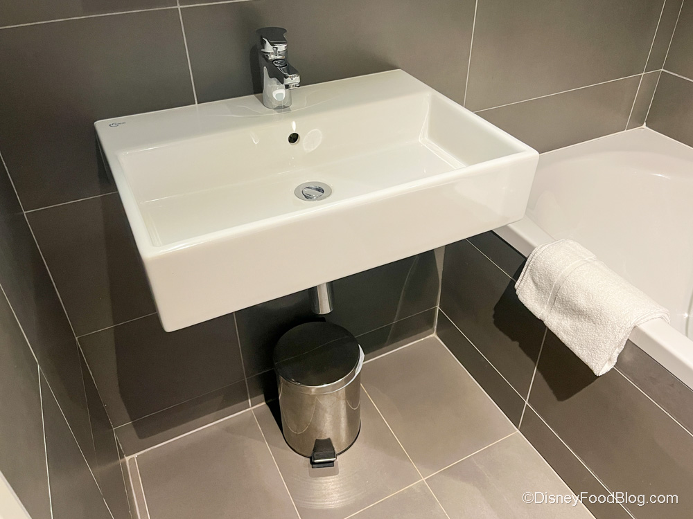 The bathroom features a tub (which is rare in European hotels) with a handheld shower head.