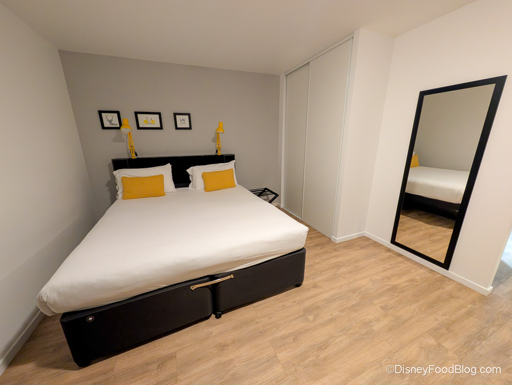 This room features a separate bedroom, too. The bed has underbed storage, which is NICE. There’s also a full-length mirror in this room.