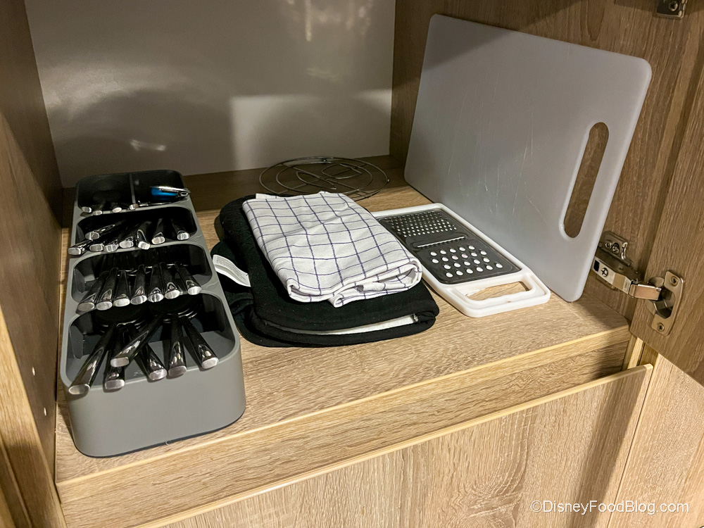 You’ll find things like an electric kettle, cooking utensils, and more on the counter.