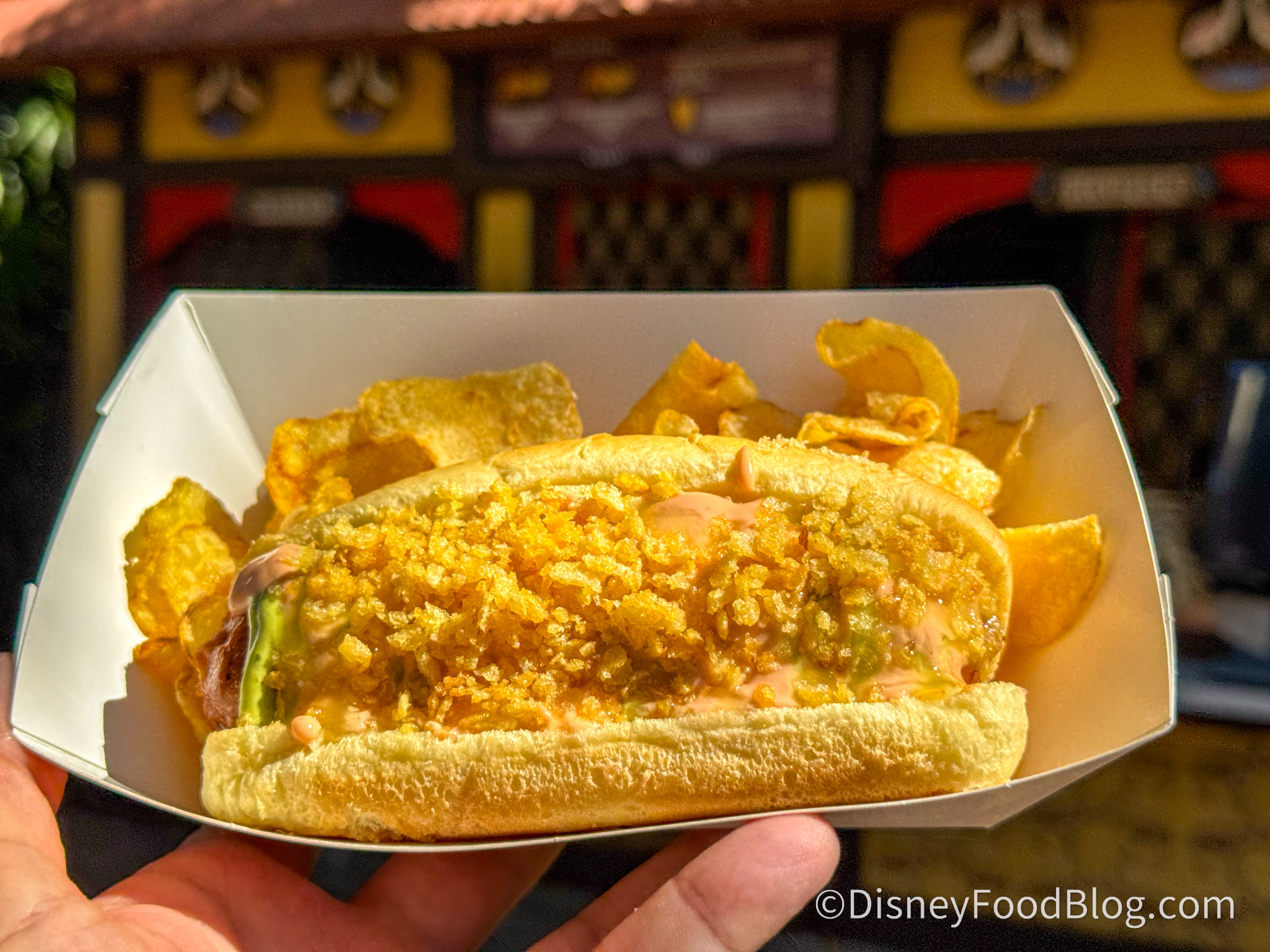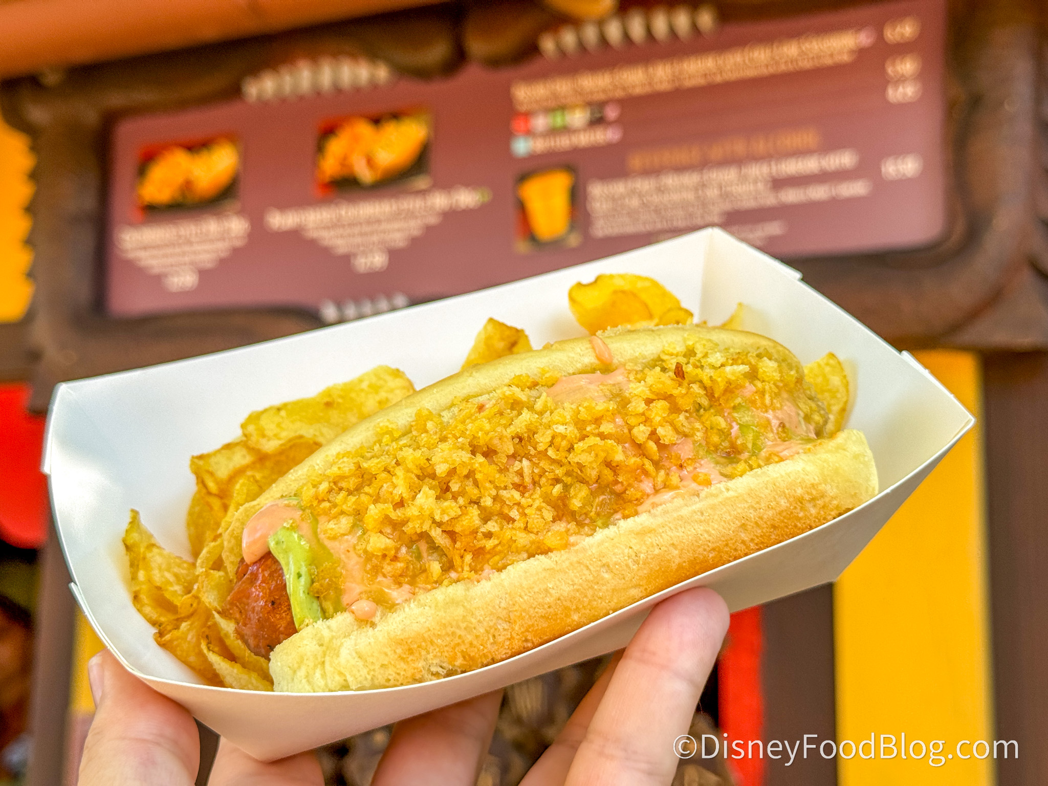 Our plant-based reporter loved this meal. If you loved the Plant-Based Slaw Dog from Casey’s Corner that has been removed from the menu, this might be one to take its place. While not exactly the same, it’s equally as delicious. It tastes deeply seasoned and is cooked to keep it juicy, unlike many plant-based sausages we’re used to eating. With great taste and juicy texture, it was really the sauces that made us go wild about it. The salsa verde is creamy, bright, and tastes like it has cilantro and a touch of lime in it. The mayonnaise-ketchup topping was also creamy, and when you take a bite of everything together, the flavors were harmonious. Each element can stand on its own, but put together, it feels completely new. The crushed potato chips on top added a crunch along with a bite of salt, and we were impressed by how well all the toppings stayed on the hot dog. We couldn’t taste the pineapple sauce, which we were looking forward to, but we loved the light spice or warmth from the hot dog. While it might be too much for some if you don’t like spicy food, it was just the right amount for us. Even though it reminds us of the Slaw Dog, it still feels fresh and exciting, and we can tell how much effort the chefs put into creating an equal plant-based version. As our reporter said, “In a park full of foods I love, this one’s a standout,” and as a team that literally eats Disney food every single day, that’s a big compliment!