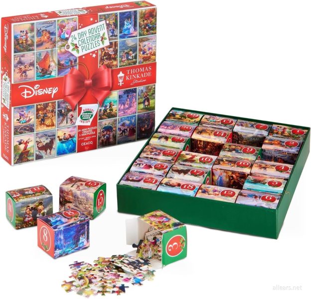This Advent Calendar contains 24 mini-puzzles that, when complete, create one 1,000-piece puzzle, all with Disney artwork from legendary painter Thomas Kinkade.